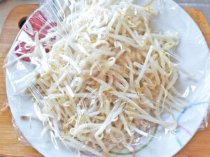 ![]() 1:もやしは、耐熱皿に乗せてラップをして、レンジで1分ほど温め、水洗いしてから、水気を良く切っておきます。 |