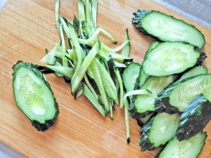 ![]() 2:きゅうりは、斜め薄切りにしてから、細切りにしましょう。 |