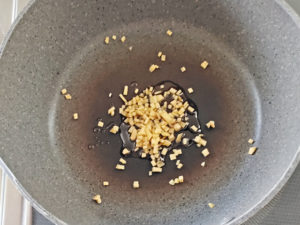![]() 4:フライパンにごま油大1(分量外)を引き、みじん切りにした生姜を炒めて香りを出しましょう。 |
