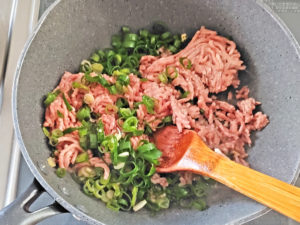 ![]() 5:フライパンにひき肉とネギも投入し、木べらで切り崩しながら、ひき肉がポロポロになるまで炒めます。 |
