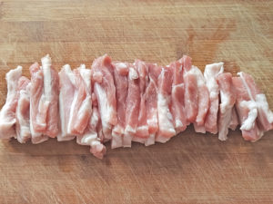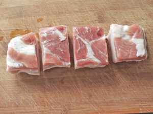 ![]() 1:豚肉は、まず4等分に切ります。 |