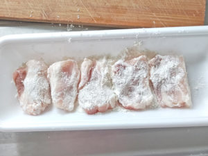 ![]() 3:豚肉に薄力粉を薄くまぶしておきます。 |