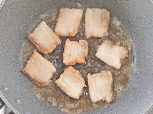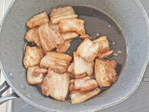 ![]() 4:フライパンに少し多めに油(分量外)を引き、豚肉を片面1分ずつ中火で焼き、皿などに取り出しておきましょう。 |