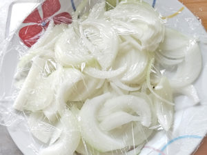 ![]() 6:耐熱皿に玉ねぎを敷き、ラップをかぶせて、レンジで3分ほど加熱しましょう。 |