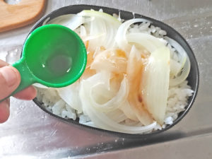 ![]() 10:器にご飯を盛りつけ、上に玉ねぎを等分に乗せ、タレを大2ずつくらい回しかけます。 |