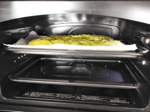 ![]() 14:コンベクションオーブンが温まったら、上段に生地を乗せた天板を入れ、下の段に、天板かバットを置いて、お湯(分量外)を多めに注ぎ入れます。 |
