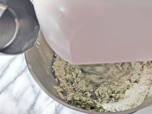 ![]() 1:スタンドミキサーに、強力粉、塩、ドライイースト(塩の反対側に)、グラニュー糖、抹茶、生地用オリーブオイルを入れます。 |