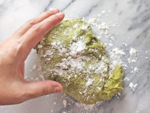 ![]() 4:台に強力粉(分量外)で打ち粉をし、生地を取り出し、生地の上にも軽く打ち粉をしたら、表面が滑らかになるまで手で捏ねましょう。 |