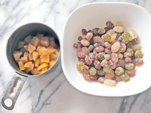 ![]() 7:生地を発酵させている間に、栗の甘露煮は小さめに刻み、甘納豆はパッケージから出しておきます。 |