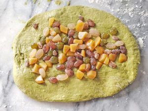 ![]() 10:生地を一つ取り、めん棒で長方形に伸ばしたら、栗と甘納豆の半量を生地に埋め込むようにし、くるくるとロールケーキのように巻き、先端は細くしましょう。 |