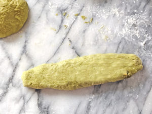 ![]() 9:生地を台に取り出し、再び打ち粉をして軽くまとめたら、スケッパーで2等分します。 |