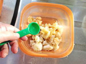 ![]() 1:バナナは皮をむいて、粗みじん切りにし、レモン汁(分量外)小1をかけて混ぜておきます。 ※バナナの変色を防ぎます。 |