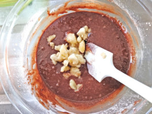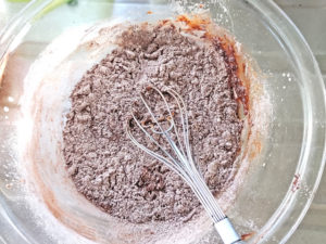 ![]() 6:ボールに、薄力粉、ココア、ベーキングパウダーを合わせてふるい入れ、粉っぽさがなくなるまで混ぜます。 |