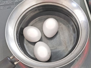 ![]() 1:小鍋に水と卵を入れて沸騰させ、沸騰したら、12分ほどゆでてゆで卵を作ります。 2:すぐに冷水にとり、殻をむいておきましょう。 |