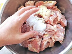 ![]() 4:大きめのボールに、生姜、にんにく、食べやすく切った鶏肉、上白糖を加えて手でもみこみましょう。 ※砂糖を加えると、肉が柔らかくなります。 |