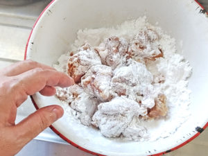 ![]() 6:他のボールを用意し、片栗粉2カップ弱を入れ、肉に薄く粉をまぶします。 |