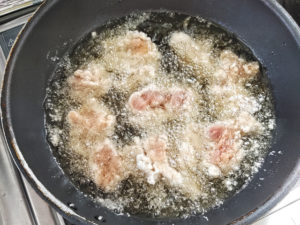 ![]() 7:180度くらいの油に、少し多めに肉を入れ、軽くきつね色になるまで揚げましょう。 ※多めに入れると、一旦油の温度が下がるので、きつね色になる頃にはしっかりと火が通ります。 |