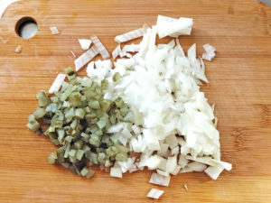 ![]() 8:タルタルソースの玉ねぎは皮をむいてみじん切りに、ピクルスもみじん切りにします。 |