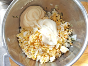 ![]() 9:容器にフォークでつぶしたゆで卵と玉ねぎ、ピクルス、マヨネーズを混ぜて、タルタルソースを作りましょう。 |