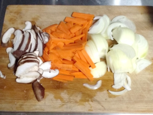 ![]() ③玉ねぎは皮をむいて薄切りに、人参は皮をむいて薄い棒状に、椎茸は軸を取って薄切りにします。 |