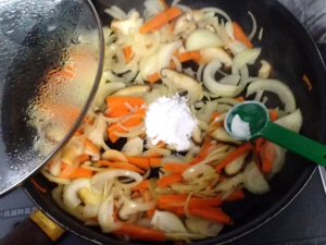 ![]() ⑦ハンバーグを焼いている間に切った野菜をフライパンに加え、しんなりするまで炒めます。 ⑧野菜がしんなりしたら、上新粉を加えて、良く混ぜ合わせます。 |