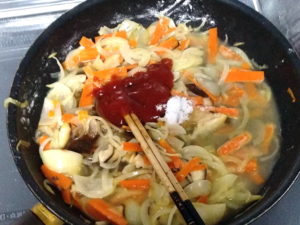 ![]() ⑨水200cc(分量外)を少しずつ加えて、上新粉を溶かしつつ混ぜましょう。 ⑩砂糖、コンソメ、ウスターソース、ケチャップも加えて良く混ぜ合わせます。 |