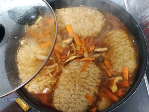 ![]() ⑪ハンバーグが焼きあがったらフライパンに加え、蓋をして弱火か中火で12分程煮ましょう。 |