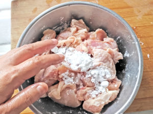 ![]() 2:鶏肉と片栗粉をボールに入れ、粉を肉全体にまぶしましょう。 |