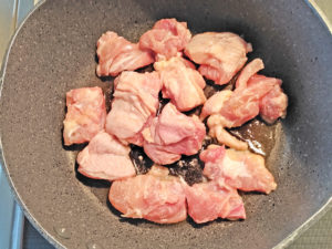 ![]() 3:フライパンに油を引き、まず、肉の片面を焼きます。 |