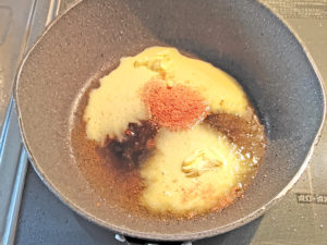 ![]() 6:フライパンから一旦肉を取り出し、マーガリンを溶かして、めんたい粉を加え、よく混ぜます。 |