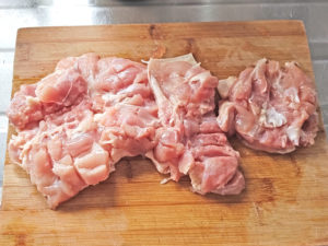 1:鶏肉は2枚に切り、浅く切れ込みを入れて、火の通りを良くしておきます。