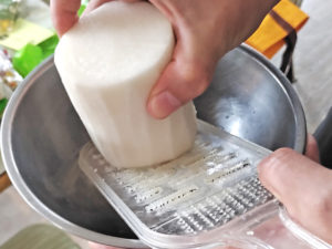 5:鶏肉を揚げている間に、大根の皮をむき、おろし金ですりおろしておきます。