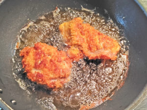3:フライパンに多めに油(分量外)を用意し、180度になったら、鶏肉を投入します。