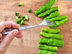 ![]() 1:シシトウはへたを落とし、フォークで1個ずつ穴を数か所あけます。 ※シシトウが破裂するのを防ぎます。 |
