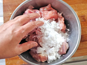 ![]() 3:ボールに鶏肉と片栗粉を入れ、手で肉に粉をまぶします。 ※鶏肉1枚に対して片栗粉大1くらいの分量です。 |
