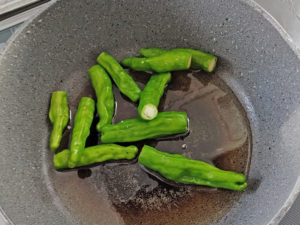 ![]() 4:テフロン加工のフライパンにサラダ油を引き、シシトウを1分ほど炒めて、取り出しましょう。 |