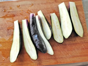 ![]() 1:ナスはへたを取り、縦半分にそれぞれカットします。 |