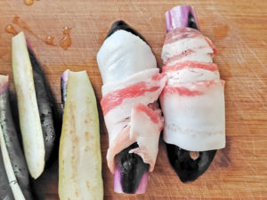 ![]() 2:ナス1本ずつに、肉を1枚ずつ巻き付けていきましょう。 |