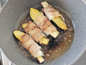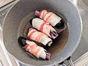 ![]() 3:テフロン加工のフライパンに、油をひかず、肉巻きナスを並べたら、弱めの中火で片面4分ずつ焼きます。 ※油がすごいので、別途油をひかなくても大丈夫です。 |