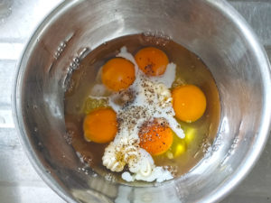 ![]() 1:ボールに卵、牛乳、マヨネーズ、塩、黒コショウをよく混ぜて、卵液を作ります。 |