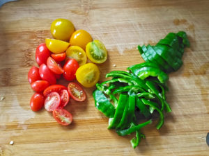 ![]() 2:ミニトマトはへたを取って2等分に、ピーマンは種とへたを取り、細切りにしましょう。 |