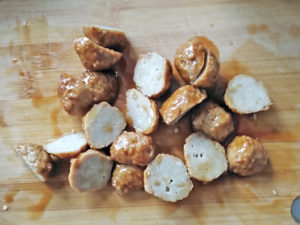 ![]() 3:肉団子もそれぞれ2等分にします。 |