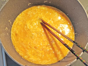 ![]() 4:テフロン加工のフライパンに油を引き、油が温まったら、卵液を加えて、軽くかき混ぜて半熟状態まで焼きましょう。 ※半熟になってから、一度フライ返しで底をはがしておくと後でやりやすいです。 |