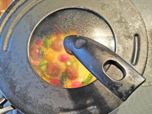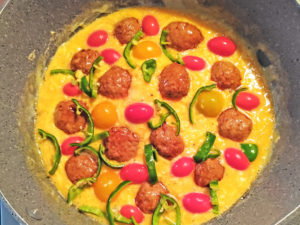 業スーのタレ付き肉団子で、家庭菜園で取れたミニトマトやピーマンを使って、オープンオムレツにしてみました。テフロン加工のフライパンなら、簡単です。