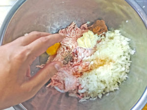 ![]() 2:大きめのボールに、ひき肉、卵、刻んだ玉ねぎ、味噌、マヨネーズ、塩、黒コショウ、ナツメグを加え、軽く粘りが出るまで捏ねましょう。 3:ラップをして、冷蔵庫で30分置きます。 |