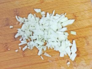 ![]() 4:冷蔵庫で冷やしている最中に、ソースの準備。 5:ソースの玉ねぎは、みじん切りにしましょう。 |