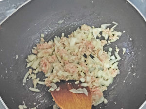 ![]() 6:フライパンを2つ用意しておき、片方にサラダ油大1(分量外)を引き、ソース用の玉ねぎとひき肉を炒めます。 7:肉が白くなればOK。 |