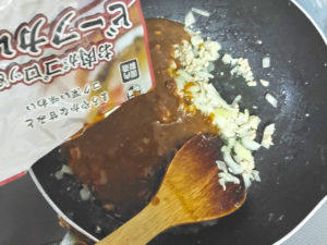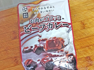 ![]() 8:今回は、ソースに業スーの「お肉がごろっと入ったビーフカレー」を使いました。 |