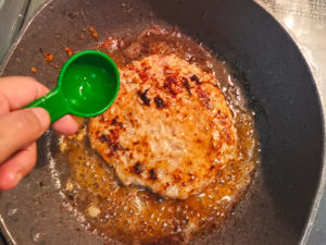 ![]() 12:そっと肉をひっくり返したら、水を大1加え、蓋をして、3分加熱します。 ※肉の厚みにもよりますが、3~4分で大丈夫です。 |