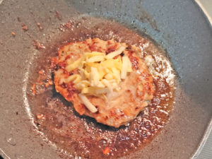 ![]() 13:肉が焼き終わる1分前になったら、チーズを素早くハンバーグの上に乗せ、蓋をしてさらに焼きましょう。 14:個数分繰り返します。 |